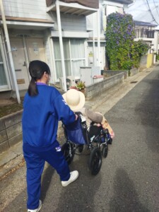 職員見守りのもと少しだけ車椅子を押してもらいました